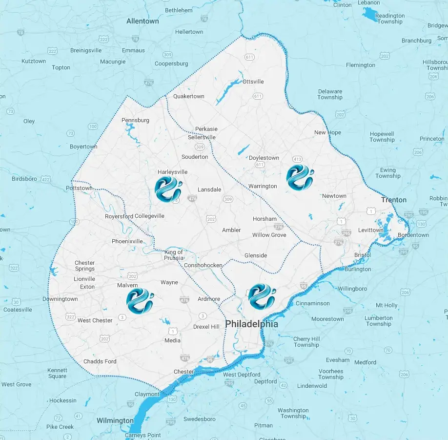 We work in the following areas: Philadelphia, Bucks County, Montgomery County, Chester County, Delaware County, Doylestown, Chalfont, Ivyland, Langhorne, Newtown, Warrington, Warwick, Churchville, Richboro, Feasterville, Jamison, Furlong, Warminster, Conshohocken, Blue Bell, Norristown, King of Prussia, Lansdale, West Chester, Downingtown, Malvern, Ardmore, Havertown, Media, Levittown, Feasterville-Trevose, Southampton, Willow Grove, Abington, Jenkintown, Glenside, Cheltenham, Plymouth Meeting, Horsham, Hatboro, Ambler, Collegeville, Phoenixville, Royersford, Exton, Paoli, Berwyn, Wayne, Radnor, Villanova, Bryn Mawr, Haverford, Wynnewood, Narberth, Bala Cynwyd, Merion Station, Gladwyne, Lafayette Hill, Oreland, Fort Washington, Newtown Square, Broomall, Marple, Haverford Township, Lower Merion, Penn Valley, St. Davids, Devon, Frazer, West Goshen, Schuylkill, Tredyffrin, Easttown, Willistown, East Whiteland, West Whiteland, Uwchlan, West Brandywine, Charlestown, Upper Uwchlan, East Nantmeal, Lower Moreland, Huntington Valley, Maple Glen, North Wales, Bryn Athyn, Elkins Park